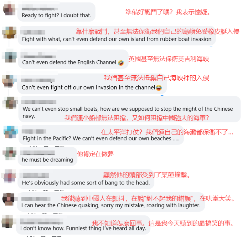 還有網友批評指出,英國有些政客似乎患有妄想症,不去解決英國國內存在的諸多問題,反而自以為是地去干涉起他國事務。更有人直言,這是一種“危險的妄想(Dangerously delusional)”,英國實際的軍事實力根本不足以讓某些政客說大話。 據了解,近來,英國頻頻操縱台灣議題。2024年12月,英國下議院通過所謂“台灣國際地位”動議。今年(2025年)初,英國議會下院議員、反華分子圖根哈特到台灣竄訪。6月中旬,英國皇家海軍巡邏艦“斯佩”號(HMS Spey)以“航行自由”為名,過航台灣海峽。6月24日,英國外交發展大臣拉米在英議會下院就“對華政策評估”發表講話,就涉台等問題說三道四。 對此,中國外交部發言人郭嘉昆曾表示,台灣問題純屬中國內政,不容外來干涉。破壞台海和平穩定的是“台獨”分裂活動和外部勢力縱容支持。有關國家和組織如果真心希望台海和平穩定,就應順應國際社會堅持一個中國原則的大勢,恪守對中方所作政治承諾,尊重中國的主權和領土完整,反對任何形式的“台獨”。(完) 【編輯:丘志彬】