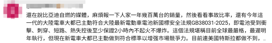 還有台灣網友特別注意到大陸電動汽車的安全性。他提到,大陸官方今年4月發佈的“史上最嚴電池安全令”,將於明年執行,現在大陸新的電動汽車大都已主動做到符合標準,以增強市場競爭力。