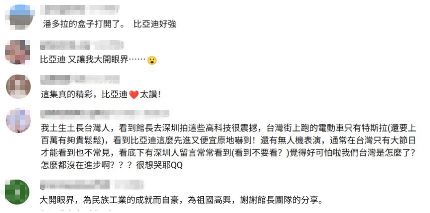 “館長”(左)參訪比亞迪工廠。視頻截圖 其實,在“館長”第二次大陸行啟程前,比亞迪可能進軍台灣市場的消息已經在台灣島內引發高度關注。台灣綠營如臨大敵,給比亞迪扣“統戰”“信息洩露”“衝擊本土產業”等帽子。但有台灣民調顯示,希望比亞迪進口台灣市場的受訪者(44.4%)比不希望比亞迪進口台灣市場的受訪者多(30.2%),而且有26.1%受訪者表示想購買比亞迪。 因此,“館長”此次大陸行參觀比亞迪工廠的行程備受關注。他在出發前就曾坦言,此行想看看中國大陸的造車水平到哪裡。 還有媒體注意到,“館長”在深圳的行程中,特意乘坐的是比亞迪旗下豪華品牌騰勢汽車,并全程向粉絲展示車輛性能與配置。他直言,希望用這種親身體驗,打破部分台灣民眾對大陸製造的偏見。 截止8月18日15時,“館長”參訪比亞迪工廠的油管(YouTube)直播視頻獲得超102萬次觀看。台灣網友們紛紛驚嘆於大陸的科技發展,“比亞迪好強”“看到比亞迪這麼先進又便宜,原地嚇到”“大開眼界,為民族工業的成就而自豪”……