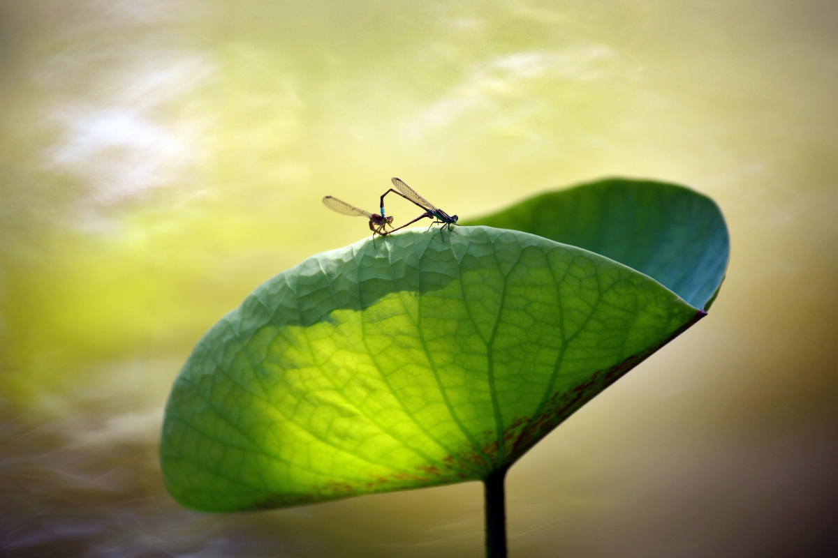 透光的荷葉,兩隻葦笛細蟌交配,組成一個甜蜜的心形。愛,是在荷葉頂端共舞。