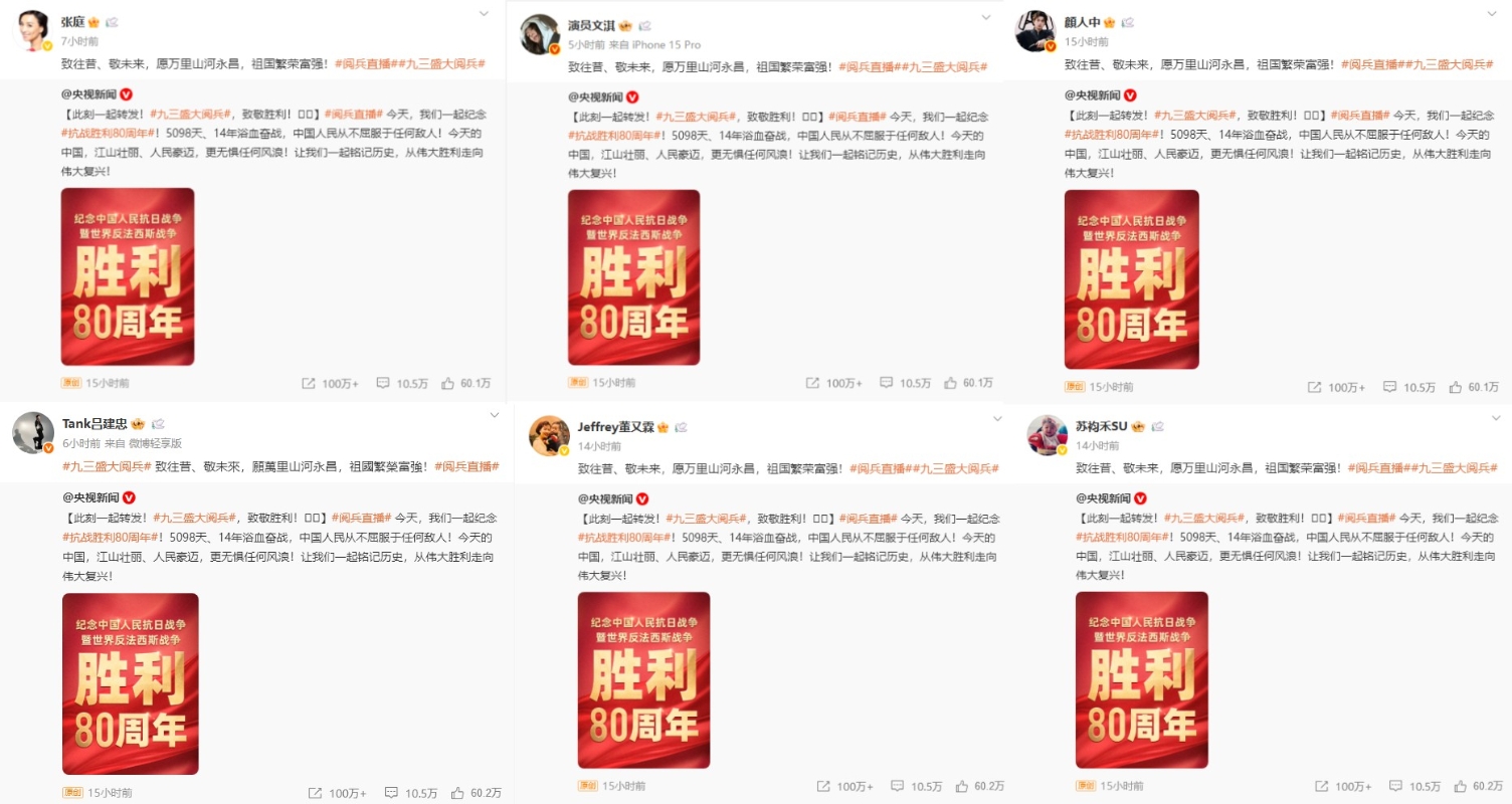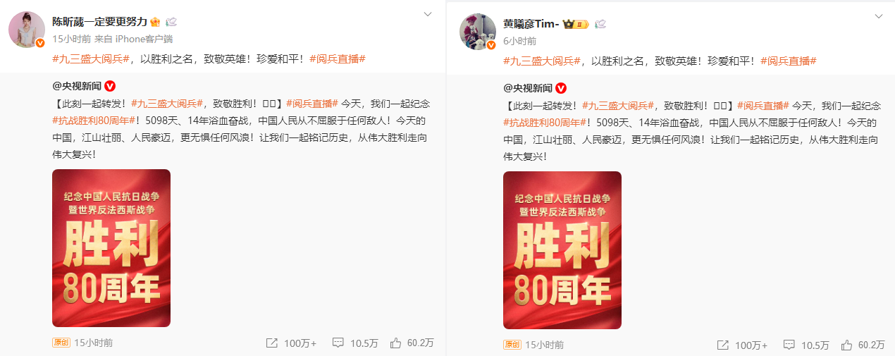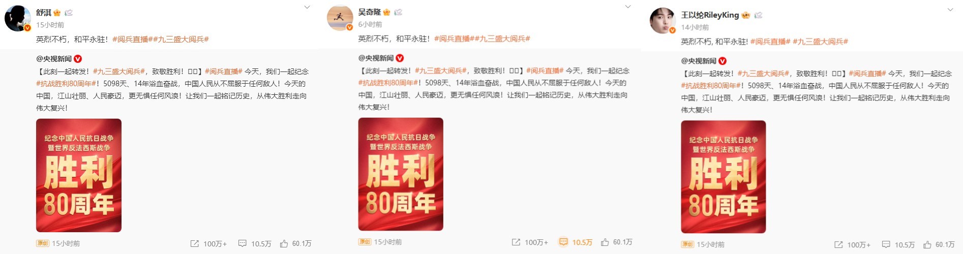 (九三閱兵)多位台灣藝人轉發九三閱兵貼文:英烈不朽,和平永駐!分享到: