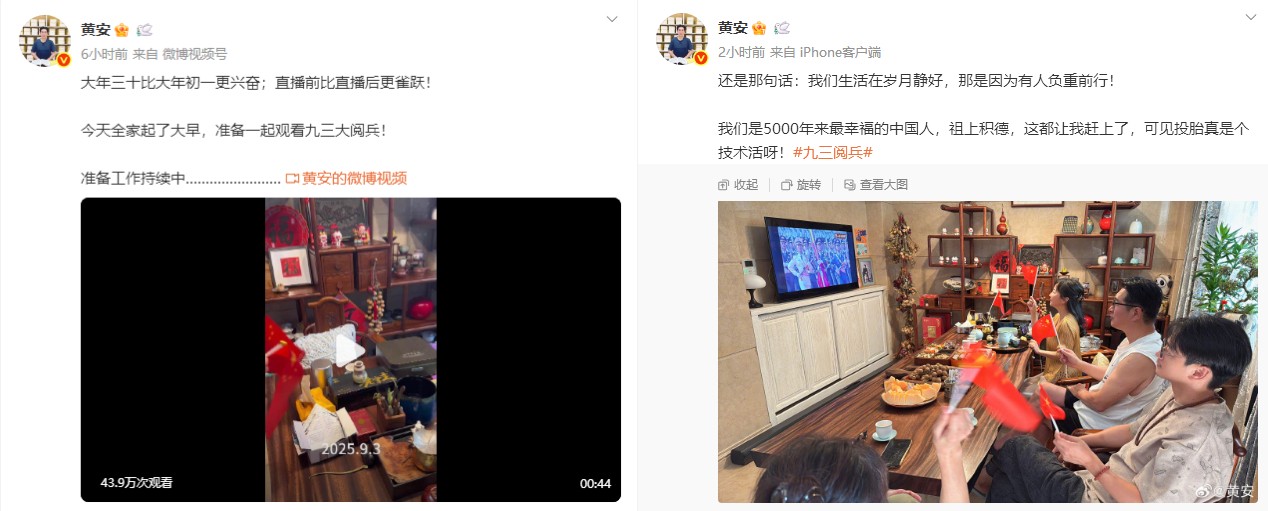 另外,黃安一早就在微博表示:“今天全家起了大早,準備一起觀看九三大閱兵!”他還說:“我們生活在歲月靜好,那是因為有人負重前行!我們是5000年來最幸福的中國人。”并附上一家人坐在家裡觀看九三閱兵的照片。