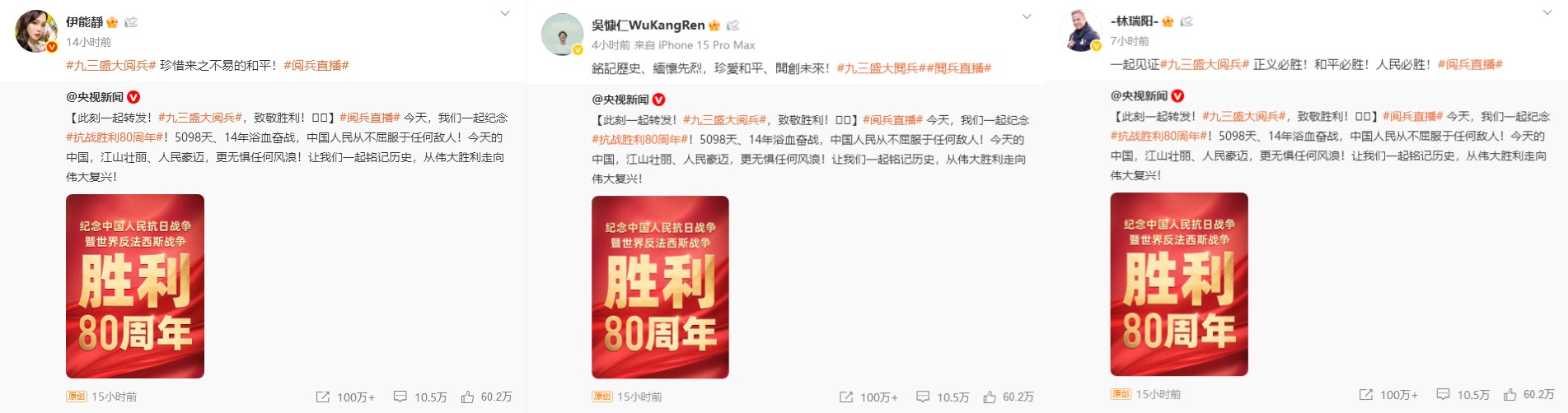 伊能靜表示:“珍惜來之不易的和平!” 吳慷仁表示:“銘記歷史、緬懷先烈、真愛和平、開創未來!” 林瑞陽則高喊:“一起見證九三盛大閱兵!正義必勝!和平必勝!人民必勝!”