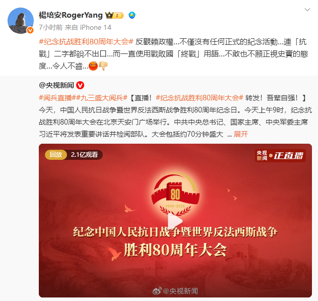 楊培安則轉發大陸紀念抗戰勝利80周年大會的直播,并批評台灣民進黨當局在抗戰勝利日沒有任何紀念活動,也不敢使用抗戰用語,反而一直使用戰敗國的“終戰”,“不敢也不願正視史實的態度令人不齒”。