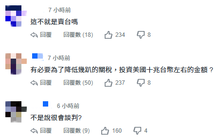 台灣網友評論截圖 值得注意的是,雖然台當局行政機構負責人卓榮泰、經濟部門負責人龔明鑫都表示,該消息並未確定,但台立法機構民眾黨黨團副總召張啓楷今天(13日)下午表示,台當局經濟部門副負責人何晉滄已經在備詢時承認,台當局對美投資金額就是在這個區間(3500億至5500億美元),且這種投資模式就是所謂的“台灣模式”,也意味著要把台灣的半導體產業移到美國。張啓楷擔憂,“護台神山”(台灣半導體產業)若變成“半屏山”,人才流失和產業空洞化的問題不容忽視。 (完) 【編輯:張依珊】