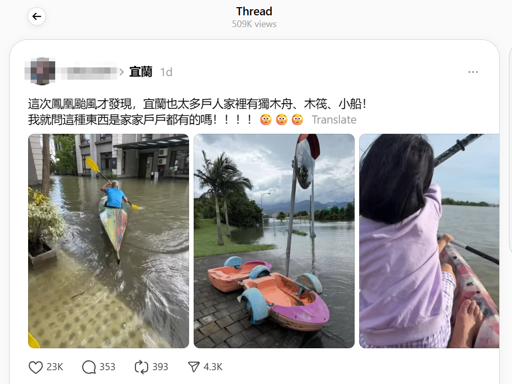 (Threads截圖) 不少宜蘭居民反映,這一情況確實存在。一位網友提到,他的鄰居曾在某年颱風造成嚴重淹水後,便用竹筏幫助他姐姐安全搭乘客運回家。另一位居民表示,位於冬山河畔的武淵社區,許多家庭都擁有小船。不少人分享道,二十多年前的颱風天,家中的小船成為了必備的出行工具,甚至有居民提到,他們家中的竹筏在水位上升時也發揮了重要作用。 此外,有網友補充道,宜蘭地區的水田休耕季節,居民常會在田間划船,這使得水上工具在當地生活中變得相對普遍,“因為宜蘭種一期水稻,當休耕時,就可以放小船在上面划,宜蘭民宿會有幾家備有獨木舟,只要有船的大部分都是民宿家裡的船,所以算是很常見的水上工具”。(完) 【編輯:黃璇】