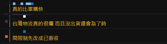 台灣網友評論截圖 “最終都會卡在台灣海關跟物流。”有台灣網友透露,物流卡在台灣海關,曾卡過接近一個星期,有網友則直言自己被卡過10天,甚至更久,“台灣物流沒效率,每次都等好幾天,不知道在慢什麼。”