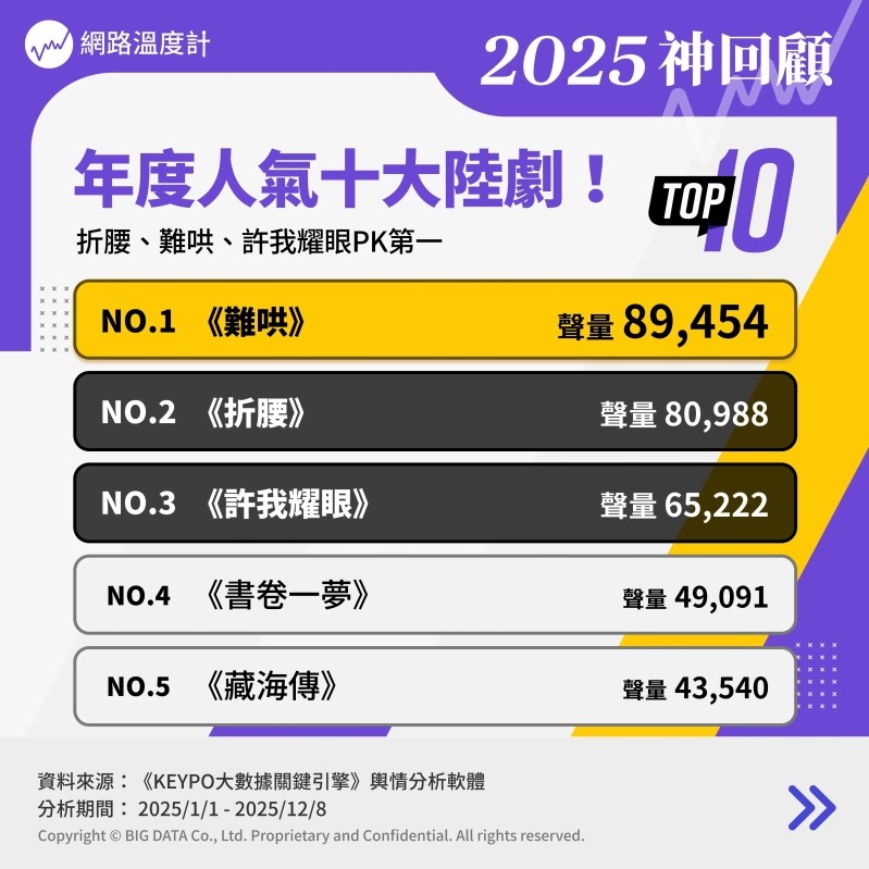 年終盤點:從追劇到“玩梗”,2025年這些大陸文化內容在台掀起熱潮香港新聞網12月24日電 過去一年,各類來自大陸的文化活動內容,在台灣掀起陣陣熱潮,在兩岸民眾間激蕩起深切的情感共鳴。 大陸電視劇2025年在台灣的熱度不止。近日,台灣網絡熱門話題分析網站“網路溫度計”通過聲量等輿情數據分析,盤點出2025年十大人氣陸劇。其中,《難哄》《折腰》《許我耀眼》分列前3名,4到10名依序為《書卷一夢》《藏海傳》《凡人修仙傳》《赴山海》《天地劍心》《無憂渡》《水龍吟》。