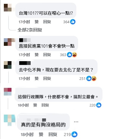 圖為台灣網友評論 台前“立委”郭正亮直言,由此事可以看出民進黨雞腸鳥肚的程度太不可思議。台媒體人樊啓明認為,卓榮泰刻意改口叫“台灣 101”,說穿了就是不想幫蔣萬安“做球”的“升格戰術”,“太小家子氣”,反而暴露了台當局與地方縣市競合的不成熟。 中國國民黨“立委”李彥秀表示,“台北101就是台北101,它也是台灣的,不用特別去強調,這凸顯出‘卓院長’的突兀,跟他的格局的狹小。” 國民黨青年部前主任陳冠安表示,綠營急著抹黑造謠,說穿了就是“害怕台北被看見”。他質疑卓榮泰改稱“台灣101”是為了削弱台北市政府的角色,直言“只想著政治攻防,滿腦政治算計,真的大可不必”。 國民黨前發言人楊智伃認為,賴清德、卓榮泰的發文,讓“不分藍綠都該一起祝賀的事”,淪為“一場小鼻子小眼睛的文字遊戲”。她指出,除了卓榮泰的改名爭議,賴清德的帖文通篇不提台北市政府,同樣也是“格局縮水、心眼放大的政治帖文”。 對於“台灣101”引起的風波,民進黨立法機構黨團幹事長鍾佳濱有意淡化政治聯想,認為就像分辨“桃園機場”還是“台灣機場”一樣,無須對於名稱的使用過於介意或放大檢視。 然而,台媒揭露,綠營內部的“正名”執念始終蠢蠢欲動。 台灣“品觀點”認為,霍諾德挑戰台北101的高度,意外映照出綠營高層狹隘的心態。台灣《聯合報》指出,把“台北101”改為“台灣101”,早在2024年底賴清德的“子弟兵”綠委郭國文就提過這個建議,但不了了之。而台灣網絡民調也顯示,對於將“台北101”更名為“台灣101”,有超過8成台灣民眾表示不同意或支持原名,足以證明蕭美琴、卓榮泰及郭國文的想法顯然不是主流意見。