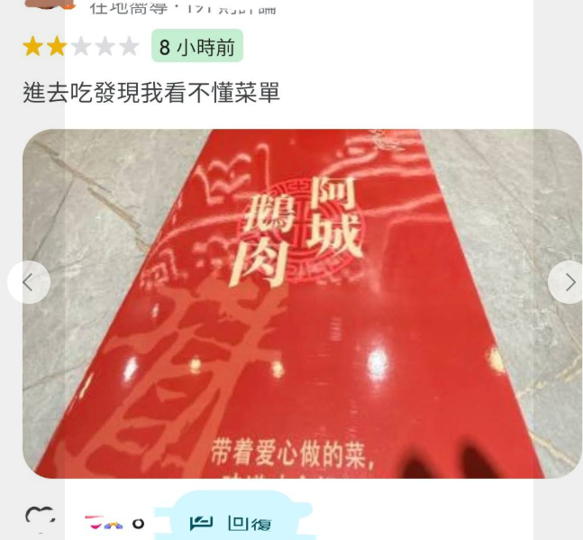 香港新聞網1月30日電 (記者 鄭竣凱)台灣美食名店“阿城鵝肉”近日於新北市三峽北大商圈開出新門店。近期店內菜單封面被發現出現簡體字,在社交媒體上引發討論,有部分網友到點評網站灌入負評。