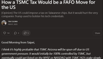 香港中通社2月15日電 台北消息:台當局日前宣布簽署台美“對等貿易協議”,但芯片議題未寫入條款。外媒稱,台積電或需再追加1000億美元對美投資,完整細節可能在4月才會公布。 英國《金融時報》報道,台美“對等貿易協議”雖然把台灣輸美商品關稅水平調整到與美國其他主要貿易夥伴一致的15%水平,但最關鍵的芯片議題未寫入正式條文。 報道稱,台美協議建立在台灣科技企業兌現對美投資2500億美元的基礎上,以在美設廠生產芯片換取芯片關稅豁免,但相關投資承諾的細節不足。