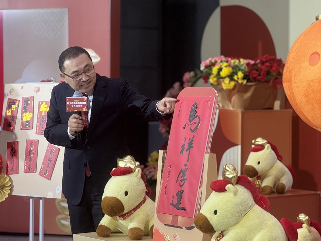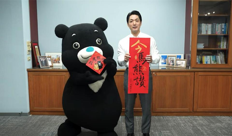 韓國瑜馬年春聯 (圖源:韓國瑜臉書) 台北市長蔣萬安今年親自揮毫書寫春聯“今馬熊讚”,以台北市政府吉祥物“熊讚”,再結合閩南語諧音“今嘛上贊”,祝福市民新的一年每個當下都美好。