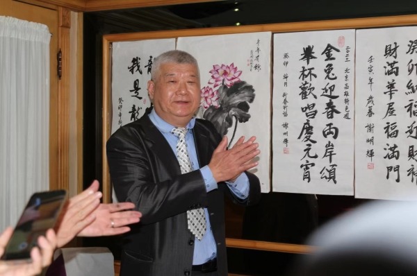第二屆世界華人與兩岸詩詞書畫名家邀請展3日在台北開幕 (謝明輝提供) 本次大展由台灣中華詩詞藝術協會主導,聯合兩岸多家文化團體共同協辦。大展選用了南宋愛國詞人辛棄疾的《青玉案·元夕》作為古典基調。與之輝映的,是大會主席、台灣中華詩詞藝術協會理事長謝明輝創作的三首詩詞。 在活動舉辦地兩大展覽室中,藝術佳作琳瑯滿目。知名畫家李意含教授的主題畫作,將元宵的熱鬧盛景與東方水墨的留白意境完美融合。書法名家王大平以其擅長的隸書與草書,書寫了謝明輝理的兩首主題詩詞。謝明輝親自創作的草書《元宵》及行書巨作“東風夜花放千樹,玉壺光轉慶元宵”,彰顯了一位文化領袖推動兩岸和平的堅定決心。