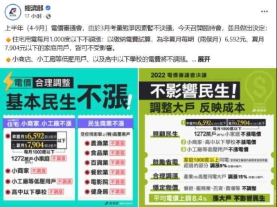 香港中通社資料圖 台灣當局經濟部門當天舉行電價費率審議會,審議4月至9月的電價費率。考量中東區域衝突升溫與國際關稅變化所衍伸的風險,審議會決議這次電價不調整,維持平均電價3.7823元每度。 參會的台灣商總理事長許舒博表示,面對當前中東戰爭情勢未明朗,當局除確保石油、天然氣來源供給穩定外,電價對物價影響極為敏感,一旦調漲則沒有回頭路,且台灣“中油”已於本月23日調漲油價,如果“油電雙漲”,對企業是雙重成本疊加,會加速連鎖反應“萬物齊漲”,對產業及民生造成重大影響。 據台媒報道,台電曾在2018年10月至2022年4月期間維持電價連續8次“凍漲”,之後在2022年7月加開臨時會宣佈平均漲幅8.4%;2023年4月上漲11%;2024年4月漲11%;2024年10月漲8.8%;2025年4月台電未能獲千億台幣補貼,於去年10月調漲民生電價,平均漲幅0.71%至平均3.7823元。(完) 【編輯:馬華】