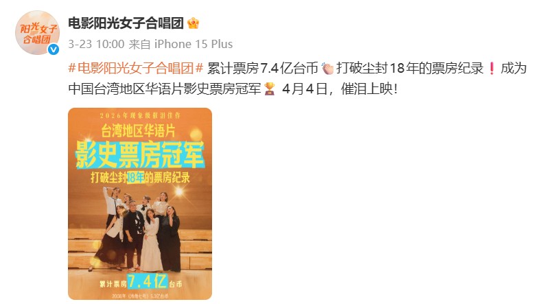 23日,該片微博官方賬號發文介紹,《陽光女子合唱團》 累計票房7.4億台幣,打破塵封18年的票房紀錄,成為中國台灣地區華語片影史票房冠軍。4月4日,催淚上映!