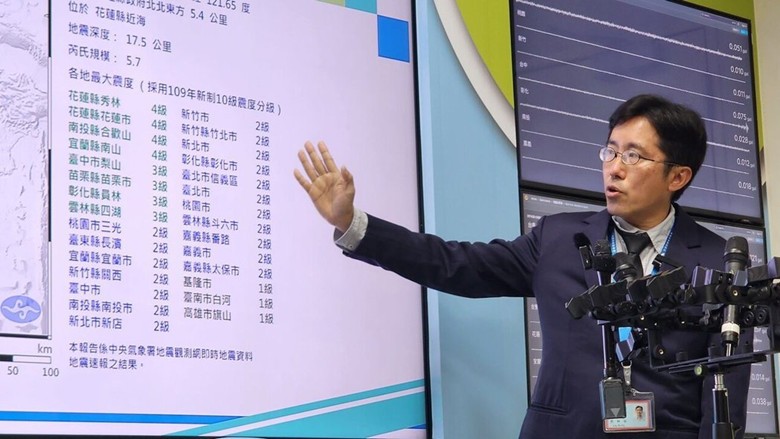 台灣花蓮縣4月5日凌晨1時14分發生規模5.7地震,幾乎台灣全島有感。圖為台灣地震測報中心科長林柏佑介紹相關情況。台灣”中央社“圖片 綜合多家台媒4月5日報道,台灣花蓮縣4月5日凌晨1時14分發生規模5.7地震,地震深度17.5公里,最大震度4級,清晨5時23分再發生規模4.8地震,地震深度23.7公里。 據悉,此次震中位於花蓮縣近海,最大震度花蓮縣太魯閣、花蓮縣花蓮市、宜蘭縣南澳3級。台北市、新北市震度為1級。 台灣地震測報中心科長林柏佑指出,本次地震除了是獨立事件,也是今年最大地震。至今共有三起規模5.5以上的地震,包括今年2月24日宜蘭近海發生規模5.6地震;今年3月12日發生規模5.7地震。 林柏佑解釋,本次地震是因菲律賓海板塊及歐亞大陸板塊擠壓所致。這起地震主要成因仍是板塊隱沒所致,而花蓮正好就在板塊隱沒帶位置;該地區地震發生較頻繁,地震深度深至淺都有。 台灣氣象部門則提醒,雖然這次是花蓮地區正常的能量釋放,但提醒未來三天有可能發生規模5或5.5的餘震,請民眾多加防範。(完) 【編輯:豐悅】