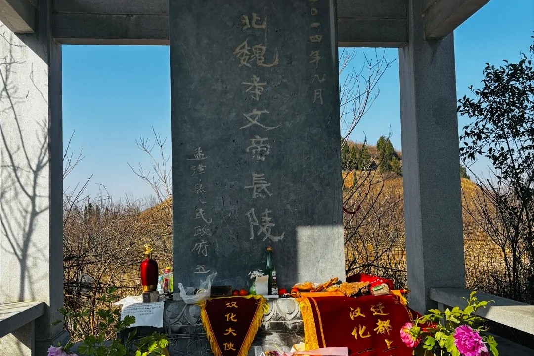 湖北荊州,張居正墓前的痔瘡膏。圖源自小紅書 北魏孝文帝元宏(原名拓跋弘)的墓前,掛上了“漢化大使”的錦旗,也有獎狀寫著“最佳漢化組”,用以紀念這位鮮卑族皇帝力推漢化的舉措。