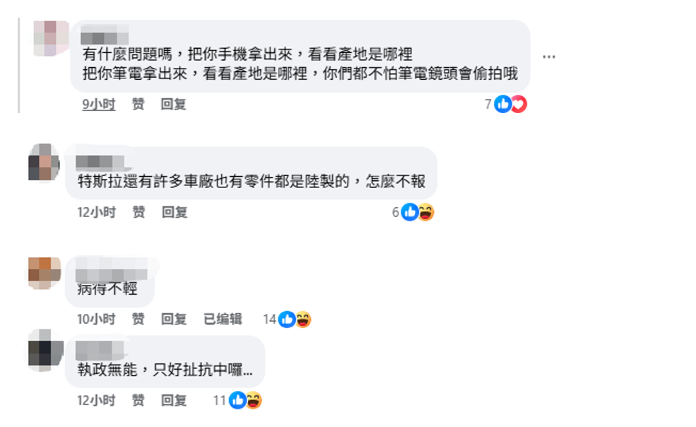 網友評論 在相關消息評論區,有網友指出,其實大陸製產品早已融入台灣民眾的日常生活,從手機、電腦到電動汽車隨處可見,諷刺綠營政客怎麼不怕產地為大陸的筆記本電腦會通過鏡頭偷拍?“真懷疑他們(綠營政客)家的東西沒有陸製的嗎?” “執政無能,只好扯抗中!”有網友一針見血道。 中國國台辦發言人曾表示,民進黨當局出於一己私利,罔顧島內民眾對優質產品的期盼和業界對加強兩岸產業合作的呼聲,打著所謂“安全”的幌子阻止廣大台灣同胞購買和使用大陸優質產品,竭力打壓兩岸經濟交流合作。這種倒行逆施,損害兩岸企業和消費者權益,破壞和惡化台灣市場和營商環境。 【編輯:王瑤】