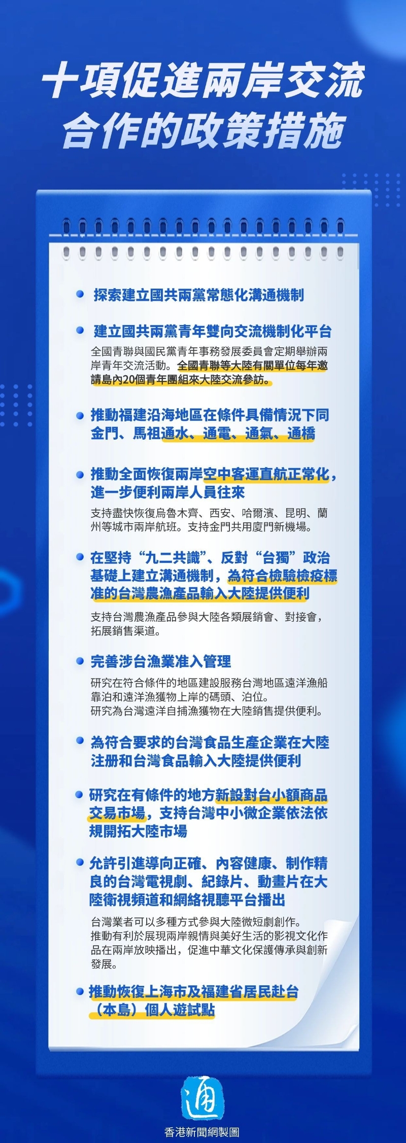 中共中央台辦4月12日受權發布最新政策措施,涵蓋國共兩黨常態化溝通、青年交流、金馬“新四通”、兩岸直航、農漁產品輸陸、影視合作等領域,具體內容戳圖了解!