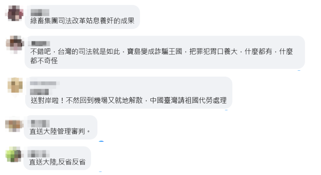 還有人指出,正是因為台當局“打詐”不力,台灣司法對詐騙姑息養奸,才導致台灣詐騙猖獗,並表示,希望這些台籍嫌犯能遣送到大陸好好反省。