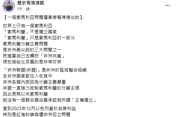 “歷史哥”社媒發文的部分內容截圖 “歷史哥”解釋,索馬里蘭分離主義問題是非洲最尖銳的三大問題之一。非洲各國內部因分離主義問題嚴重,“非洲聯盟”(非盟)一直強力抵制索馬里蘭的分離主張。長期以來,沒有任何聯合國會員國承認索馬里蘭的所謂“主權獨立”。 直到2025年12月,以色列基於自身紅海戰略利益承認索馬里蘭,但也因此遭到非盟最嚴厲的譴責與抵制。 “歷史哥”進一步指出,民進黨自己去觸怒“非洲共識”、挑戰非洲國家集體利益,因此航線上的三國不予開放領空給賴清德的專機,“根本是理所當然的事情”。如今卻甩鍋給大陸,“真的是非常好笑!”他指出,就他所知,“對岸根本沒在這件事上使力”。 三國拒絕飛越:基於一個中國原則的自主決定 島內另有分析指出,面對國際媒體詢問,拒絕飛越的三國——塞舌爾、毛里求斯、馬達加斯加,并沒有關於“中國施壓”的說法,最多隻是重申既定的“一個中國政策”。這更像是基於自身外交立場與區域政治考量而做出的決策。 據英國路透社報道,塞舌爾外交和僑務部4月21日表示,未批准台灣地區領導人包機飛越該國領空或降落,這符合該國政府不承認台灣所謂“主權”的一貫政策。 一名馬達加斯加外交部官員也表示:“馬達加斯加外交上承認世界上只有一個中國。這項決定是在完全尊重馬達加斯加對其領空主權的前提下作出的。” 毛里求斯《快訊報》則援引總理辦公室一名顧問的話表示,由於毛里求斯特別重視與中國的關係,因此“不會採取任何可能危及中毛關係的行動”。另一位消息人士則強調,毛里求斯在“一個中國”原則上維持一致立場。 “非洲新聞網”4月22日評論稱,非洲三國取消相關飛行許可,反映出非洲國家在涉及中國主權問題上的堅定立場,以及台灣在非洲的活動空間正被進一步壓縮。 繞不開的南非與莫桑比克 島內知名時事評論員郭正亮日前指出,民進黨當局“大概只講了一半的故事”。斯威士蘭幾乎被南非包圍,他實在難以想象賴清德包機一定要經過塞舌爾、毛里求斯、馬達加斯加的領空,“為什麼要這樣飛?我認為沒有說出完整的故事”。