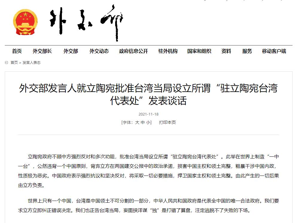 立陶宛批準設立所謂“駐立陶宛台灣代表處”,外交部:一切後果由立方負責據外交部網站11月18日消息,外交部發言人就立陶宛批準台灣當局設立所謂“駐立陶宛台灣代表處”發表談話: 立陶宛政府不顧中方強烈反對和多次勸阻,批準台灣當局設立所謂“駐立陶宛台灣代表處”。此舉在世界上制造“一中一台”,公然違背一個中國原則,背棄立方在兩國建交公報中的政治承諾,損害中國主權和領土完整,粗暴干涉中國內政,性質極為惡劣。中國政府表示強烈抗議和堅決反對,將採取一切必要措施,捍衛國家主權和領土完整。由此產生的一切後果由立方負責。 世界上只有一個中國,台灣是中國領土不可分割的一部分,中華人民共和國政府是代表全中國的唯一合法政府。我們要求立方立即糾正錯誤決定。我們也正告台灣當局,妄圖挾洋謀“獨”是打錯了算盤,註定逃脫不了失敗的下場。