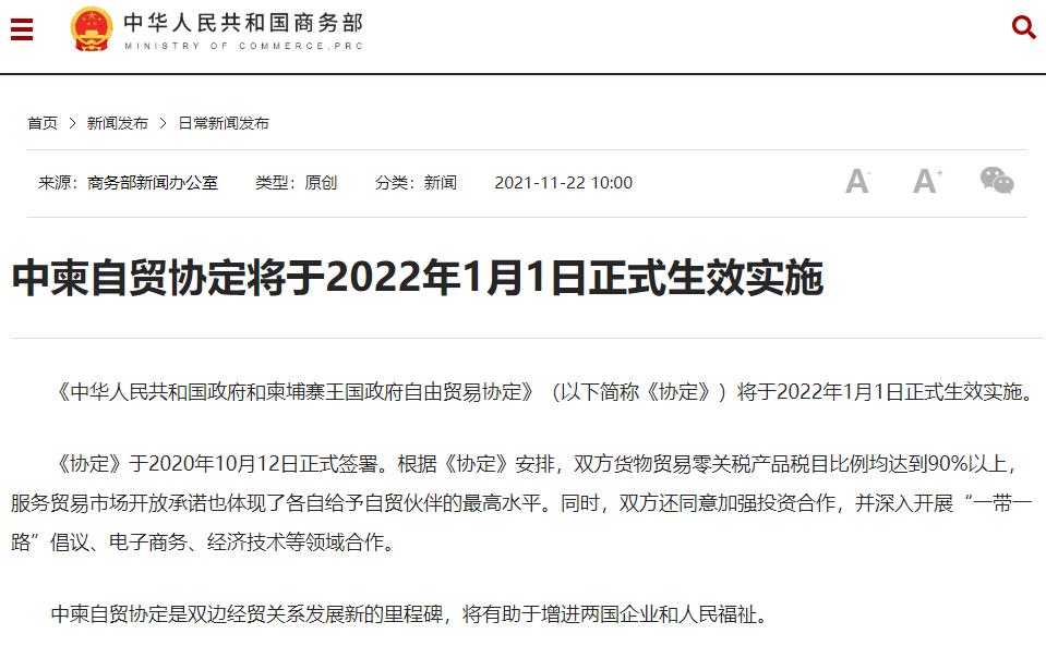 據商務部網站消息,《中華人民共和國政府和柬埔寨王國政府自由貿易協定》(以下簡稱《協定》)將於2022年1月1日正式生效實施。 《協定》於2020年10月12日正式簽署。根據《協定》安排,雙方貨物貿易零關稅產品稅目比例均達到90%以上,服務貿易市場開放承諾也體現了各自給予自貿夥伴的最高水平。同時,雙方還同意加強投資合作,並深入開展“一帶一路”倡議、電子商務、經濟技術等領域合作。 中柬自貿協定是雙邊經貿關係發展新的裏程碑,將有助於增進兩國企業和人民福祉。