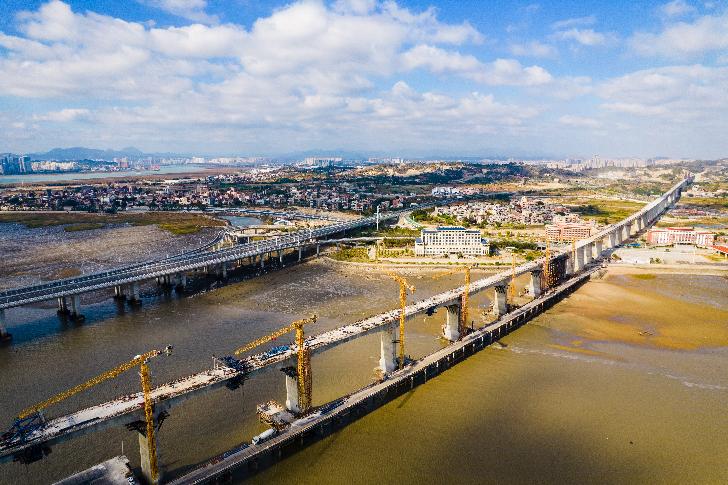 泉州灣跨海大橋主橋。 余杉芳 攝 新建福州至廈門高速鐵路(簡稱“福廈高鐵”)是國內首條跨海高鐵,北起福州市,南至廈門市和漳州市,正線全長277.42公里,設計時速350公里。 據中交二航局新建福廈鐵路6標項目經理劉福星介紹,第6標段為全線施工難度最大的標段,路線起於泉州市台商投資區,跨越泉州灣進入晉江市,全長27.455公里。其中,全線重點控制性工程——泉州灣跨海大橋全長20.287公里,海上橋梁長8.96公里,跨越泉州灣的主橋長800米、主跨400米,為雙塔雙索面鋼混結合梁半漂浮體系斜拉橋,主梁為鋼箱梁形式,由77個節段組成,采用分節懸臂吊裝,先邊跨、後中跨合龍總體施工工藝,已於今年8月初實現毫米級高精度合龍;引橋長19公里,含連續梁15聯,連續剛構23聯,連續剛構拱1聯,T構17聯,結構類型多,施工工藝復雜,其中海上連續剛構及T構共37聯,全部采用現場澆築工藝。