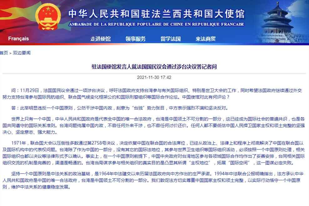 網站截圖 有記者問,11月29日,法國國民議會通過一項涉台決議,呼籲法國政府支持台灣參與有關國際組織、特別是世衛大會的工作,同時希望法國政府繼續通過外交努力支持台灣參與國際民航組織、聯合國氣候變化框架公約和國際刑警組織等國際合作論壇。中國使館對此有何評論? 使館發言人回應說,世界上只有一個中國,中華人民共和國政府是代表全中國的唯一合法政府,台灣是中國領土不可分割的一部分,這已經成為國際社會的普遍共識,也是各國共同遵守的國際關係凖則。台灣問題純屬中國內政,不容任何外來干涉,也不容任何討價還價。任何人都不要低估中國人民捍衛國家主權和領土完整的堅強決心、堅定意志、強大能力。 發言人表示,1971年,聯合國大會以壓倒性多數通過第2758號決議,決定恢復中國在聯合國的合法席位,已經從政治上、法律上和程序上徹底解決了中國在聯合國以及國際機構中的代表權問題。台灣除了作為中國的一部分,沒有其它的國際法地位,其參與世界衛生組織等國際組織活動,必須按照一個中國原則處理,相關國際組織也都以決議等法律形式予以確認。事實上,在一個中國原則前提下,中國中央政府對台灣地區參與各領域國際合作均作出了妥善安排,台同相關國際組織交流的機制是完善的,渠道是暢通的。台灣當局謀求參與相關組織的真實目的是凸顯其所謂“主權地位”,拓展“國際空間”,這一圖謀必定失敗。 發言人指出,堅持一個中國原則是中法關係的政治基礎,是1964年中法建交以來歷屆法國政府向中方作出的莊嚴承諾。1994年中法聯合公報明確指出,法方承認中華人民共和國政府是中國的唯一合法政府,台灣是中國領土不可分割的一部分。我們敦促法方切實尊重中國國家主權和領土完整,以實際行動恪守一個中國原則,維護中法關係的健康穩定發展。(完) 【編輯:凌玉辉】