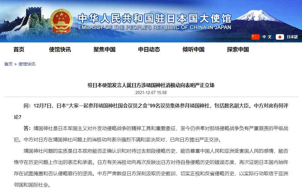 截圖。圖源:中國駐日本大使館網站 問:12月7日,日本“大家一起參拜靖國神社國會議員之會”99名議員集體參拜靖國神社,包括數名副大臣。中方對此有何評論? 答:靖國神社是日本軍國主義對外發動侵略戰爭的精神工具和重要象征,至今仍供奉對那場侵略戰爭負有嚴重罪責的甲級戰犯。中方對日方在靖國神社問題上的消極動向表示強烈不滿和堅決反對,已向日方提出嚴正交涉。 靖國神社問題的實質是日本政府能否正確認識和對待過去那段侵略歷史,能否尊重中國人民和亞洲受害國人民的感情,能否恪守在歷史問題上作出的表態和承諾。日方有關消極動向再次反映出日方對待自身侵略歷史的錯誤態度,再次證明日本國內始終存在試圖掩蓋和否認侵略罪行的逆流。中方嚴肅敦促日方深刻汲取歷史教訓,切實正視和反省侵略歷史,以實際行動取信於亞洲鄰國和國際社會。 【編輯:馬華】