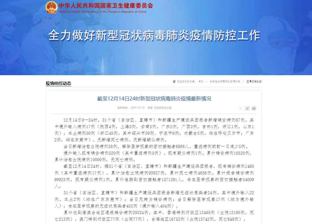 香港中通社12月15日電 據中國國家衛生健康委員會15日通報,12月14日,中國內地報告新增新冠肺炎確診病例67例。其中境外輸入病例17例;本土病例50例。