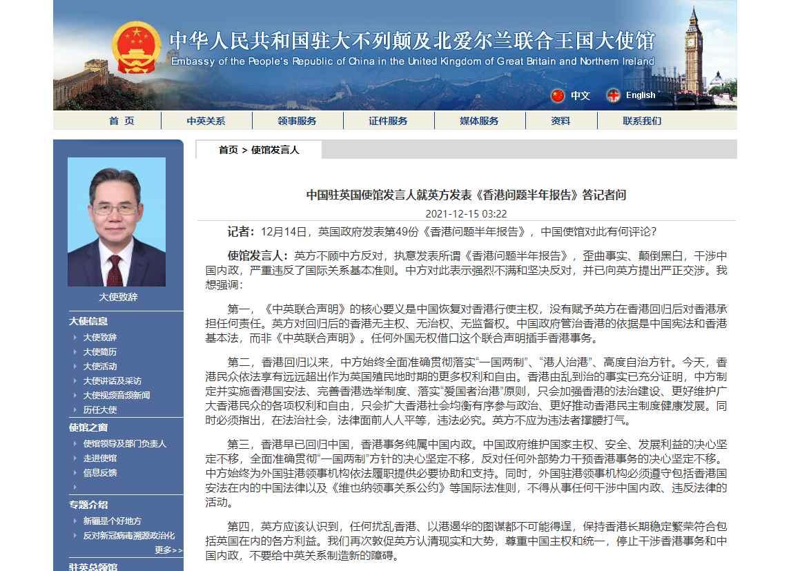 網站截圖 記者:12月14日,英國政府發表第49份《香港問題半年報告》,中國使館對此有何評論? 使館發言人:英方不顧中方反對,執意發表所謂《香港問題半年報告》,歪曲事實、顛倒黑白,干涉中國內政,嚴重違反了國際關係基本準則。中方對此表示強烈不滿和堅決反對,並已向英方提出嚴正交涉。我想強調: 第一,《中英聯合聲明》的核心要義是中國恢復對香港行使主權,沒有賦予英方在香港回歸後對香港承擔任何責任。英方對回歸後的香港無主權、無治權、無監督權。中國政府管治香港的依據是中國憲法和香港基本法,而非《中英聯合聲明》。任何外國無權借口這個聯合聲明插手香港事務。 第二,香港回歸以來,中方始終全面準確貫徹落實“一國兩制”、“港人治港”、高度自治方針。今天,香港民眾依法享有遠遠超出作為英國殖民地時期的更多權利和自由。香港由亂到治的事實已充分證明,中方制定並實施香港國安法、完善香港選舉制度、落實“愛國者治港”原則,只會加強香港的法治建設、更好維護廣大香港民眾的各項權利和自由,只會擴大香港社會均衡有序參與政治、更好推動香港民主制度健康發展。同時必須指出,在法治社會,法律面前人人平等,違法必究。英方不應為違法者撐腰打氣。 第三,香港早已回歸中國,香港事務純屬中國內政。中國政府維護國家主權、安全、發展利益的決心堅定不移,全面準確貫徹“一國兩制”方針的決心堅定不移,反對任何外部勢力干預香港事務的決心堅定不移。中方始終為外國駐港領事機構依法履職提供必要協助和支持。同時,外國駐港領事機構必須遵守包括香港國安法在內的中國法律以及《維也納領事關係公約》等國際法準則,不得從事任何干涉中國內政、違反法律的活動。 第四,英方應該認識到,任何擾亂香港、以港遏華的圖謀都不可能得逞,保持香港長期穩定繁榮符合包括英國在內的各方利益。我們再次敦促英方認清現實和大勢,尊重中國主權和統一,停止干涉香港事務和中國內政,不要給中英關係製造新的障礙。 【編輯:丘志彬】