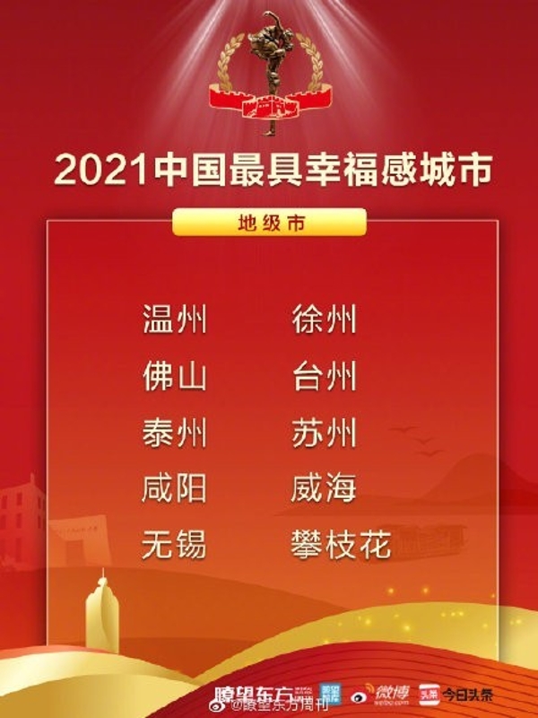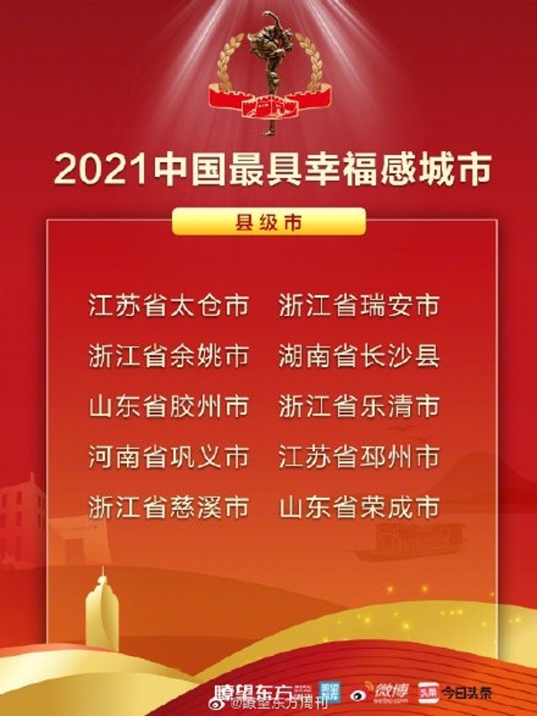 縣級城市(圖源:《瞭望東方周刊》) 據悉,“2021中國最具幸福感城市”調查推選活動以“百年紅,幸福城”為主題,圍繞著人民城市為人民、實現高質量發展為主線進行調研。該活動至今已連續成功舉辦15年,累計推選出80餘座幸福城市,“幸福城市”已成為新時代城市的名片和目標。(完) 【編輯:李彥洲】