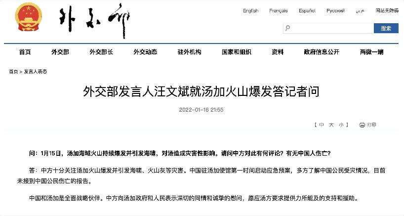 外交部網站1月16日消息,外交部發言人汪文斌就湯加火山爆發答記者問。