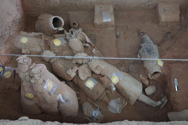 圖:新華網 這次的發掘地點位於一號坑北側中段,具體區域為G8、G10兩個過洞。其中,G8清理出陶俑15件,從中提取10件、拼對完成8件。G10清理出陶俑10件,從中提取7件、拼對完成4件。這次出土的陶俑彩繪保存狀況較好,目前考古工作者已將陶俑運至保護修復室進行保護修復,對俑坑出現的黴菌進行了科學處理,確保了文物和環境的安全。 據了解,這次發掘出土了一件將軍俑和一件中級軍吏俑。考古工作者通過梳理秦俑坑發現以來所出土的中、高級軍吏俑,特別是一號坑所出土的中、高級軍吏俑,提出一號坑的軍陣排列可能具有南北、東西向對稱的特點,這次發現對了解、研究整個一號坑的軍陣排列具有重要意義。 秦兵馬俑陪葬坑是秦始皇帝陵園外圍的一組大型陪葬坑,其中一號坑平面呈長方形,東西長230米、南北寬62米、深5米,總面積14260平方米,按照排列密度估計,全部發掘後可出土陶俑、陶馬6000餘件。# 【編輯:葉永成】