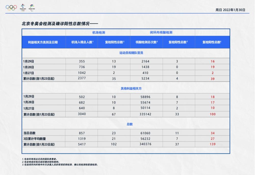 1月29日0:00至23:59,機場入境涉奧人員總數累計857人,其中運動員及隨隊官員355人,其他利益相關方502人。經海關檢測後,復檢陽性23人,其中運動員及隨隊官員13人,其他利益相關方10人。