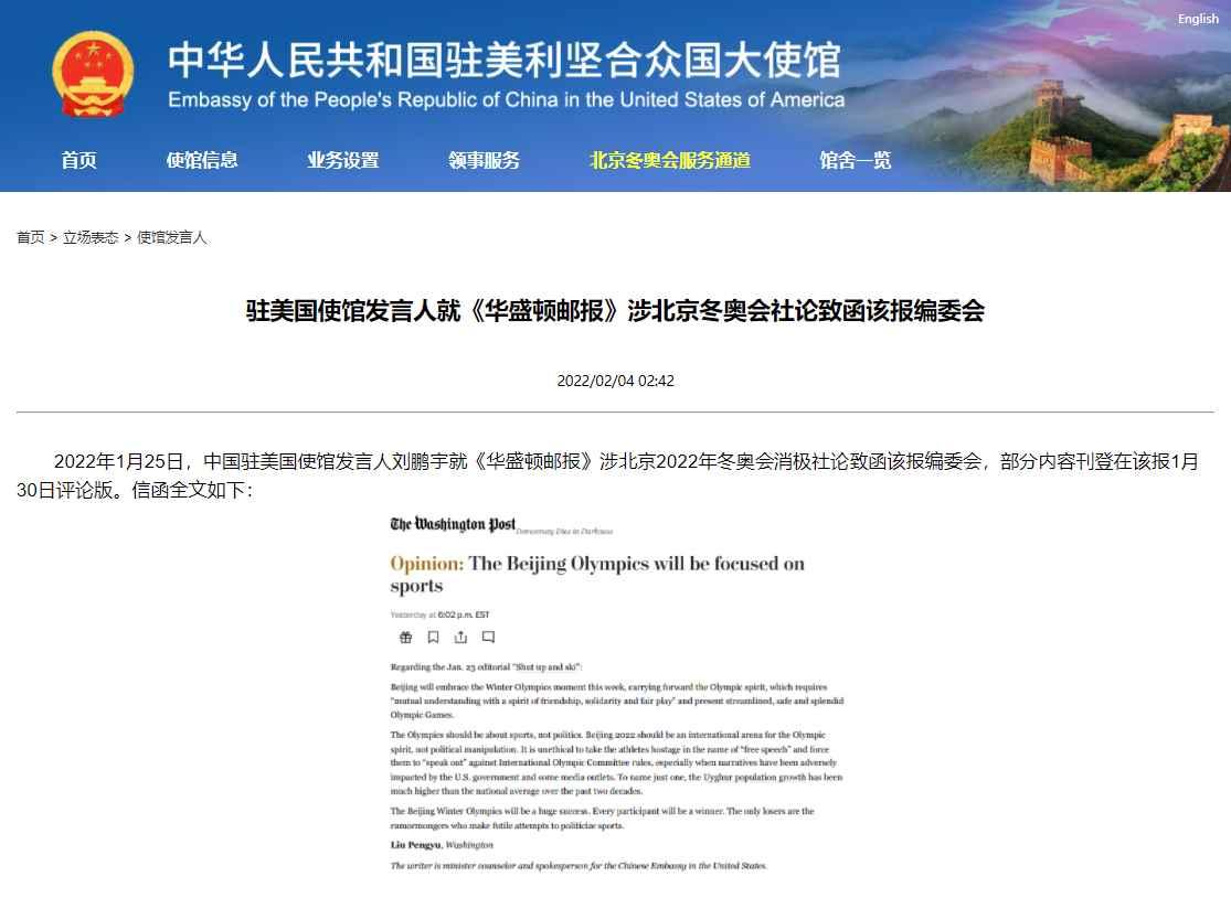 中國駐美大使館官網截圖 《華盛頓郵報》1月22日社論稱“中國向冬奧會運動員傳遞的信息:襟聲然後滑雪”。劉鵬宇1月25日就此致函該報編委會指出,以“言論自由”之名強迫運動員不顧國際奧委會規則“對外表態”,這是赤裸裸的道德綁架,尤其是社論中所鼓噪的對華論調都基於美國政府和一些媒體長期散布的涉華謊言。 劉鵬宇表示,北京即將迎來“冬奧時刻”。中方將以此為契機大力弘揚“團結友愛、公平競爭、相互理解”的奧林匹克精神,為世界奉獻一屆簡約、安全、精彩的奧運盛會。 劉鵬宇舉出一例反問:中國新疆維吾爾族人口從2000年的834萬增長至202年的1162萬,年均增長率遠高於同期全國少數民族人口的平均增長水平。如果存在“種族滅絕”,維吾爾族怎麽可能有如此大幅的人口增長? 劉鵬宇說,北京冬奧會定將取得巨大成功,每個參與者都是勝利者。那些企圖將體育政治化的造謠者必將一敗塗地。(完) 【編輯:张丽欣】