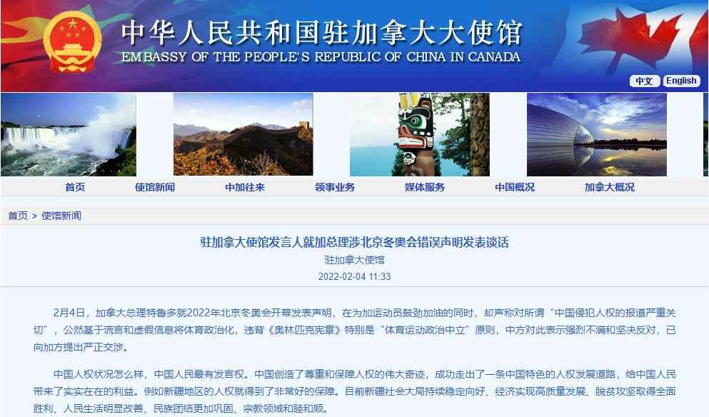 截圖。圖源:中國駐加拿大大使館網站 使館發言人說,特魯多當天就2022年北京冬奧會開幕發表聲明,在為加運動員鼓勁加油的同時,卻聲稱對所謂“中國侵犯人權的報道嚴重關切”,公然基於謊言和虛假信息將體育政治化,違背《奧林匹克憲章》特別是“體育運動政治中立”原則,中方對此表示強烈不滿和堅決反對,已向加方提出嚴正交涉。 發言人表示,中國人權狀況怎麽樣,中國人民最有發言權。中國創造了尊重和保障人權的偉大奇跡,成功走出了一條中國特色的人權發展道路,給中國人民帶來了實實在在的利益。例如新疆地區的人權就得到了非常好的保障。目前新疆社會大局持續穩定向好、經濟實現高質量發展、脫貧攻堅取得全面勝利、人民生活明顯改善、民族團結更加鞏固、宗教領域和睦和順。 發言人指出,加拿大人權狀況劣跡斑斑。歷史上,加方就對原住民實施“寄宿學校”等種族滅絕制度。直至今天,加原住民生存狀況之惡劣、加系統性種族歧視之嚴重仍令人發指。加方有何資格對他國的人權狀況指手畫腳?加一些政客、媒體不斷炒作涉疆問題,惡意散佈謠言謊言,這些作法毫無底線、毫無道理、毫無依據,螳臂當車,改變不了新疆繁榮發展、各族人民享有幸福生活的事實,也阻擋不了新疆順利前進的步伐。 發言人強調,一屆成功精彩的奧運會需要的是冬奧大家庭的共同努力,而不取決於個別國家是否派“外交代表”出席。加拿大等一小撮西方國家一再拿冬奧會做文章,大搞政治操弄,企圖干擾北京冬奧會順利進行,其行徑不得人心,注定失敗。北京冬奧會已成功開幕。相信在奧林匹克精神指引下,在各方共同努力下,中國一定能夠為世界呈現一屆簡約、安全、精彩的奧運盛會。中方也期待加運動員在北京冬奧會上取得佳績。 【編輯:馬華】