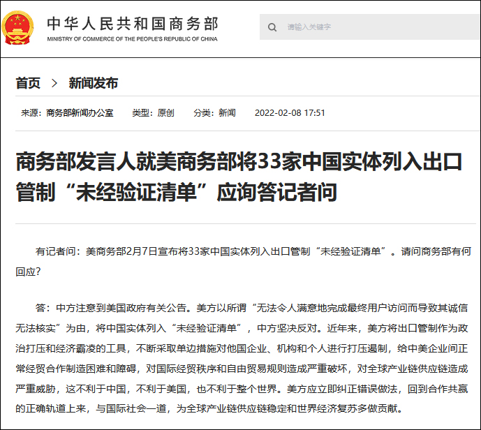 美商務部將33家中國實體列入出口管制“未經驗證清單”,中方回應分享到: