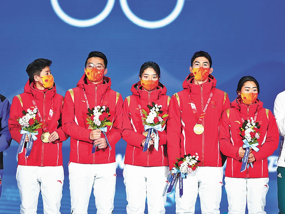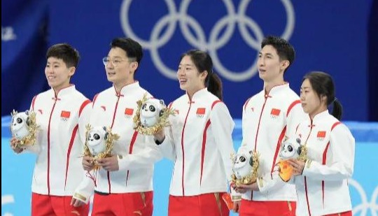 2月6日,獲得北京冬奧會短道速滑項目混合團體接力冠軍的中國隊登上領獎台(圖:中新社) 5日晚在北京冬奧會短道速滑混合團體接力決賽中,由范可新、曲春雨、武大靖、任子威組成的中國隊以2分37秒348的成績奪得冠軍,為中國代表團奪得本屆冬奧會的首枚金牌。但在比賽結束之後,站上領獎台的金銀銅牌三支隊伍,都只是從頒獎嘉賓手中接過了吉祥物“冰墩墩”而已,並沒有發獎牌、升國旗、奏國歌的儀式——北京冬奧會和冬殘奧會運動員委員會主席楊揚透露,更為隆重的頒獎儀式於第二天在頒獎廣場舉行。
