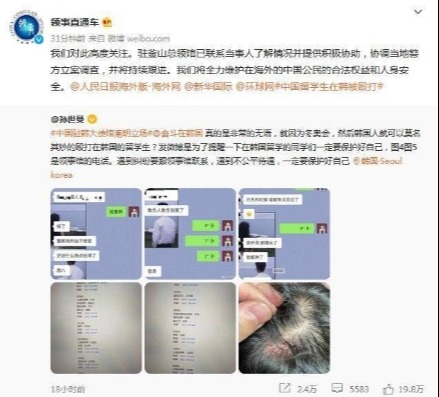 輿論紛爭致一名中國留學生在韓遭攻擊?中方:已協調當地立案調查