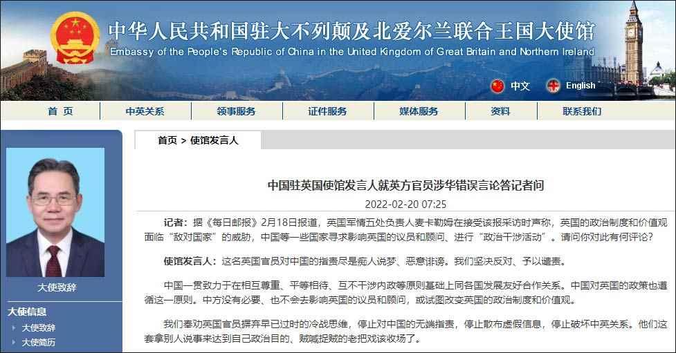 據中國駐英國使館網站2月20日消息,中國駐英國使館發言人就英方官員涉華錯誤言論答記者問。