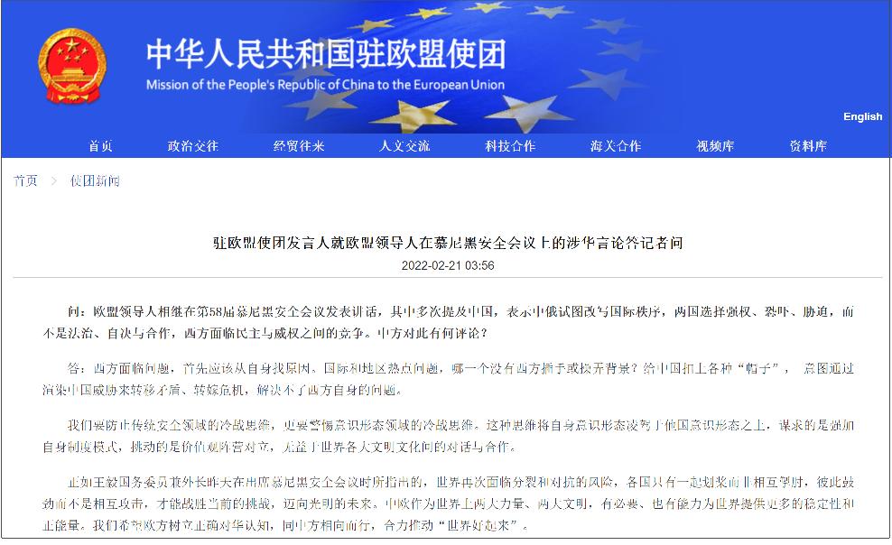 2月21日,中國駐歐盟使團發言人就歐盟領導人在慕尼黑安全會議上的涉華言論答記者問。