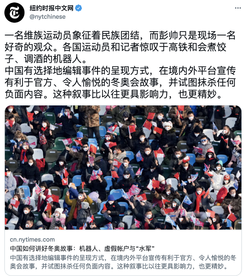 香港新聞網2月21日電 北京冬奧會於昨日(20日)落下帷幕,這一充滿歡樂和友誼的體育盛事,到了美媒口中卻變成“中國有選擇地呈現”令人愉悅的冬奧會故事。 紐約時報中文網日前發布一篇關於“中國如何講好冬奧故事”的文章,聲稱官方“通過機器人、虛假帳戶、真實的網紅和其他各種工具”,有選擇地編輯事件的呈現方式,宣傳一切有利於官方的、讓人愉悅的冬奧會故事,並試圖扼殺所有相反的東西。