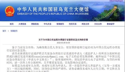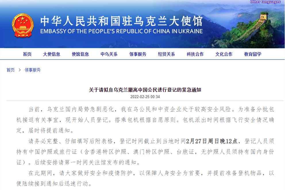 香港中通社2月25日電 2月25日,中國駐烏克蘭大使館發佈《關於請擬自烏克蘭撤離中國公民進行登記的緊急通知》,全文如下: