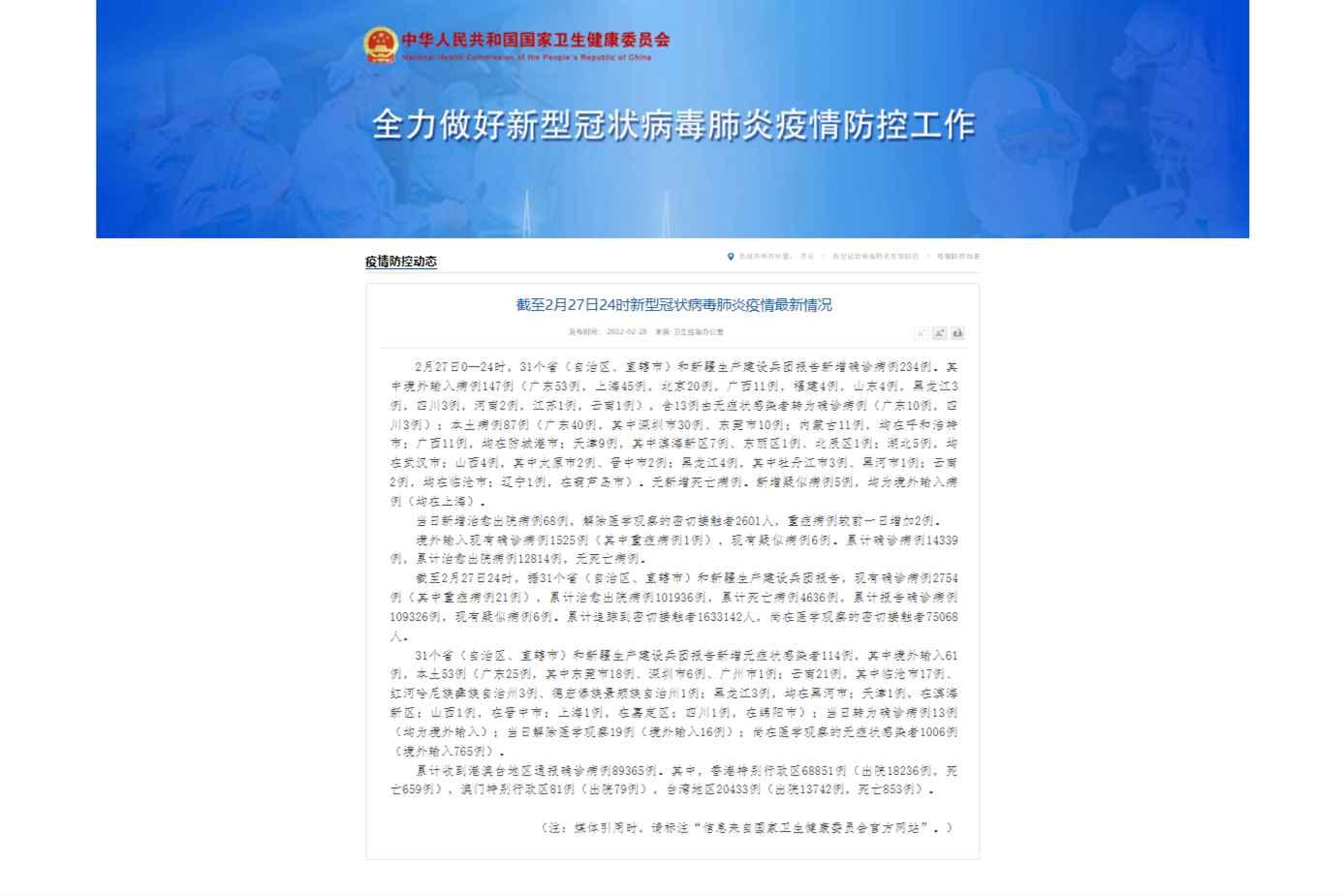 網站截圖 截至2月27日24時,據31個省(自治區、直轄市)和新疆生產建設兵團報告,現有確診病例2754例(其中重症病例21例),累計治愈出院病例101936例,累計死亡病例4636例,累計報告確診病例109326例,現有疑似病例6例。累計追蹤到密切接觸者1633142人,尚在醫學觀察的密切接觸者75068人。 31個省(自治區、直轄市)和新疆生產建設兵團報告新增無症狀感染者114例,其中境外輸入61例,本土53例(廣東25例,其中東莞市18例、深圳市6例、廣州市1例;雲南21例,其中臨滄市17例、紅河哈尼族彜族自治州3例、德宏傣族景頗族自治州1例;黑龍江3例,均在黑河市;天津1例,在濱海新區;山西1例,在晉中市;上海1例,在嘉定區;四川1例,在綿陽市);當日轉為確診病例13例(均為境外輸入);當日解除醫學觀察19例(境外輸入16例);尚在醫學觀察的無症狀感染者1006例(境外輸入765例)。 累計收到港澳台地區通報確診病例89365例。其中,香港特別行政區68851例(出院18236例,死亡659例),澳門特別行政區81例(出院79例),台灣地區20433例(出院13742例,死亡853例)。 【編輯:张丽欣】