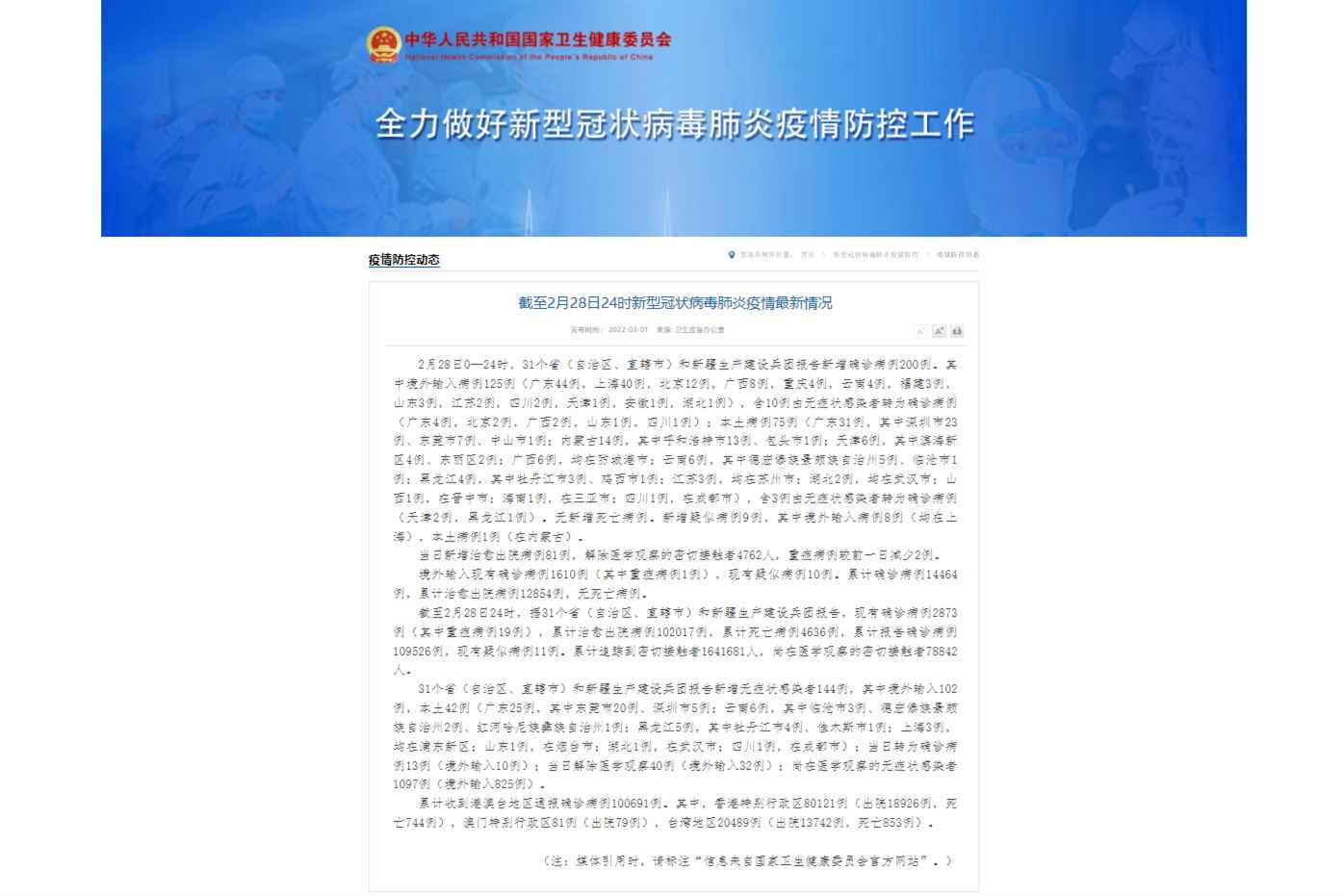 網站截圖 截至2月28日24時,據31個省(自治區、直轄市)和新疆生產建設兵團報告,現有確診病例2873例(其中重症病例19例),累計治愈出院病例102017例,累計死亡病例4636例,累計報告確診病例109526例,現有疑似病例11例。累計追蹤到密切接觸者1641681人,尚在醫學觀察的密切接觸者78842人。 31個省(自治區、直轄市)和新疆生產建設兵團報告新增無症狀感染者144例,其中境外輸入102例,本土42例(廣東25例,其中東莞市20例、深圳市5例;雲南6例,其中臨滄市3例、德宏傣族景頗族自治州2例、紅河哈尼族彜族自治州1例;黑龍江5例,其中牡丹江市4例、佳木斯市1例;上海3例,均在浦東新區;山東1例,在煙台市;湖北1例,在武漢市;四川1例,在成都市);當日轉為確診病例13例(境外輸入10例);當日解除醫學觀察40例(境外輸入32例);尚在醫學觀察的無症狀感染者1097例(境外輸入825例)。 累計收到港澳台地區通報確診病例100691例。其中,香港特別行政區80121例(出院18926例,死亡744例),澳門特別行政區81例(出院79例),台灣地區20489例(出院13742例,死亡853例)。 【編輯:张丽欣】