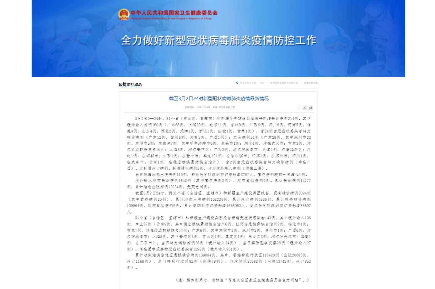 香港新聞網3月3日電 據國家衛健委網站消息,3月2日0—24時,31個省(自治區、直轄市)和新疆生產建設兵團報告新增確診病例214例。其中境外輸入病例160例(廣東66例,上海39例,北京11例,吉林9例,廣西8例,四川8例,河南5例,福建4例,山東4例,湖北2例,天津1例,浙江1例,安徽1例,甘肅1例),含24例由無症狀感染者轉為確診病例(廣東12例,四川6例,河南5例,廣西1例);本土病例54例(廣東28例,其中深圳市23例、東莞市5例;內蒙古7例,其中呼和浩特市6例、包頭市1例;湖北4例,均在武漢市;吉林3例,均在延邊朝鮮族自治州;上海3例,均在普陀區;廣西2例,均在防城港市;天津1例,在濱海新區;河北1例,在邯鄲市;山西1例,在晉中市;黑龍江1例,在哈爾濱市;江蘇1例,在蘇州市;四川1例,在成都市;雲南1例,在德宏傣族景頗族自治州),含2例由無症狀感染者轉為確診病例(均在廣西)。無新增死亡病例。新增疑似病例5例,均為境外輸入病例(均在上海)。 當日新增治愈出院病例119例,解除醫學觀察的密切接觸者3757人,重症病例較前一日增加1例。 境外輸入現有確診病例1843例(其中重症病例2例),現有疑似病例9例。累計確診病例14777例,累計治愈出院病例12934例,無死亡病例。