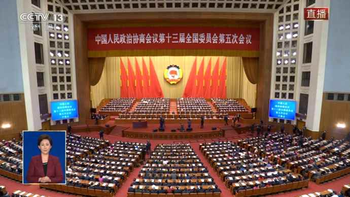 3月4日下午3時,全國政協十三屆五次會議在人民大會堂開幕。圖源:央視