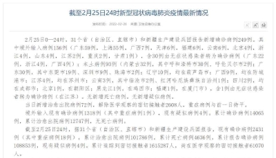 香港新聞網3月8日電 據國家衛健委網站消息,3月7日0—24時,31個省(自治區、直轄市)和新疆生產建設兵團報告新增確診病例325例。其中境外輸入病例150例(廣東47例,上海36例,北京21例,廣西17例,山東11例,甘肅7例,天津3例,浙江2例,四川2例,遼寧1例,黑龍江1例,福建1例,雲南1例),含13例由無症狀感染者轉為確診病例(廣東5例,廣西3例,浙江2例,四川2例,山東1例);本土病例175例(吉林46例,其中吉林市28例、長春市17例、延邊朝鮮族自治州1例;廣東45例,其中東莞市31例、深圳市13例、惠州市1例;山東31例,其中青島市29例、威海市2例;江蘇10例,均在連雲港市;甘肅10例,其中蘭州市5例、蘭州新區3例、白銀市1例、酒泉市1例;雲南5例,其中德宏傣族景頗族自治州3例、昆明市2例;陜西5例,均在西安市;河北4例,其中石家莊市2例、邢台市2例;上海4例,其中徐匯區3例、普陀區1例;浙江4例,均在衢州市;天津3例,其中東麗區2例、北辰區1例;遼寧3例,均在沈陽市;內蒙古2例,均在呼和浩特市;北京1例,在海淀區;山西1例,在運城市;廣西1例,在崇左市),含6例由無症狀感染者轉為確診病例(吉林3例,廣東2例,廣西1例)。無新增死亡病例。新增疑似病例5例,均為境外輸入病例(均在上海)。 當日新增治愈出院病例110例,解除醫學觀察的密切接觸者6129人,重症病例較前一日減少2例。 境外輸入現有確診病例2385例(其中重症病例2例),現有疑似病例12例。累計確診病例15606例,累計治愈出院病例13221例,無死亡病例。